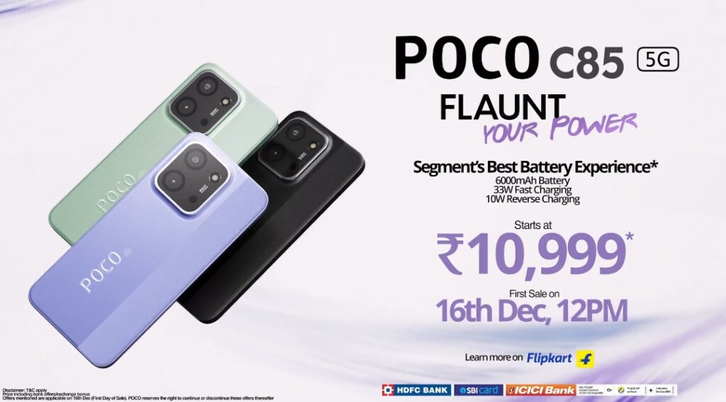 POCO C85 will go on sale exclusively on Flipkart starting 16th December, 2025 on 12 noon, at an introductory price of ₹10,999* for the 4GB+128GB variant, ₹11,999* for the 6GB+128GB variant, and ₹13,499* for the 8GB+128GB variant. As part of the launch offer, consumers can avail an instant bank discount of ₹1,000 using HDFC, ICICI, or SBI Bank credit and debit cards, or opt for a ₹1,000 exchange bonus on eligible devices. Additionally, 3-month No-Cost EMI is available across both credit and debit cards. Above offers are only applicable for the first day of sale. Terms and conditions apply.*